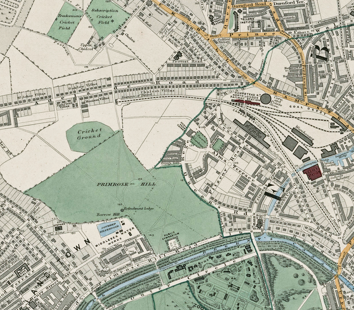 • Regent’s Park and Primrose Hill are shown in green with detailed landscaping, lakes, and pathways.