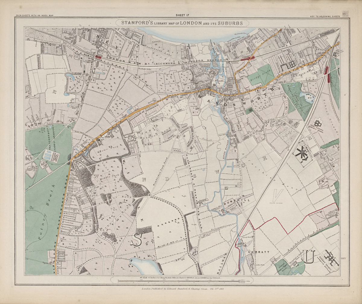 Sheet 17 depicts the south-western outskirts of London, covering Wandsworth, Earlsfield, and the approach to Richmond and Wimbledon. In the early 1870s this area retained a largely rural character with open fields, market gardens, and large estates, though railway development was beginning to encourage suburban growth.