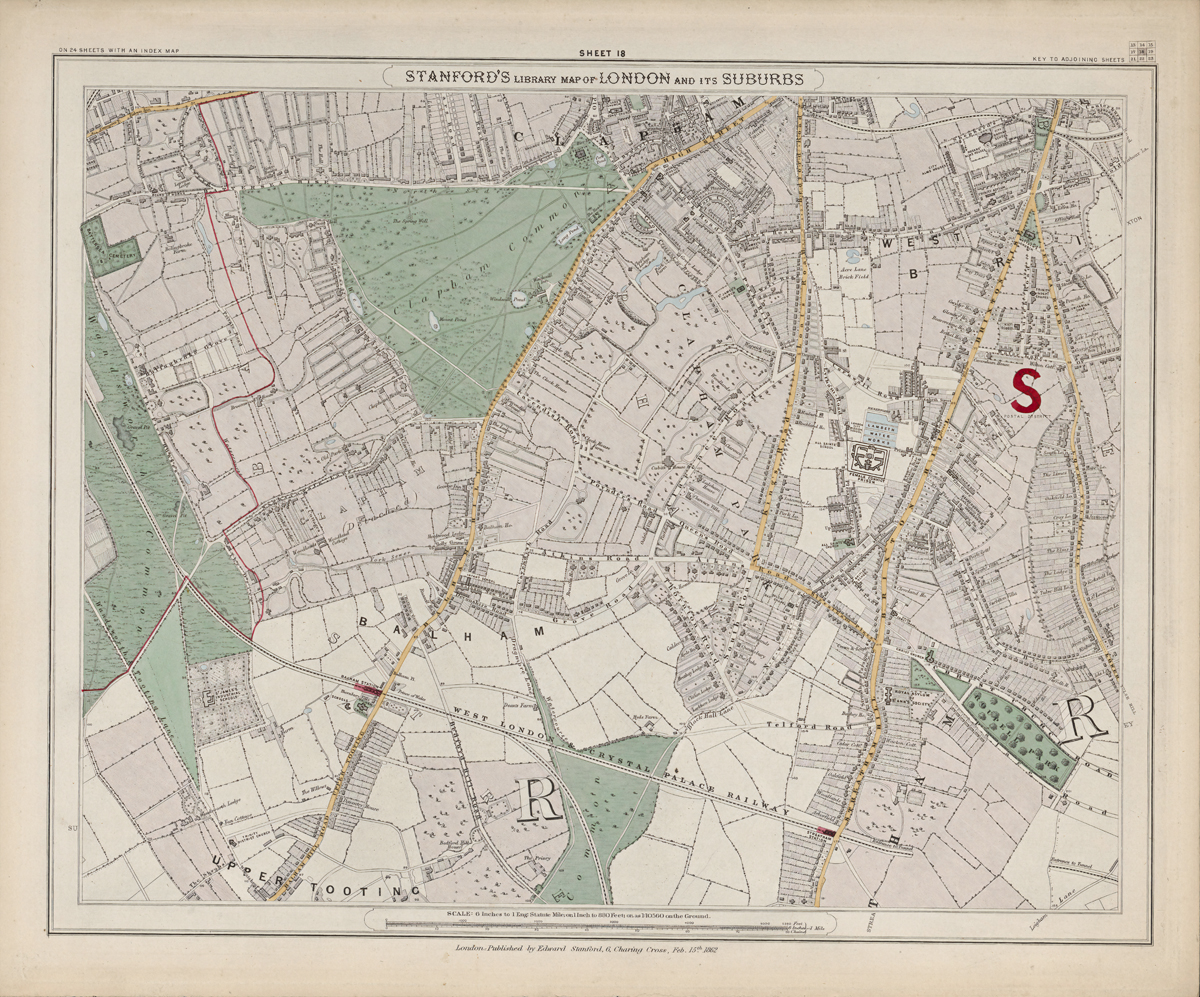 Sheet 18 shows the southern districts between Clapham, Balham, Tooting, Streatham, and the western edge of Norwood. In the early 1870s this area was a patchwork of open farmland, commons, and developing suburban streets, with key railway lines already encouraging residential growth.