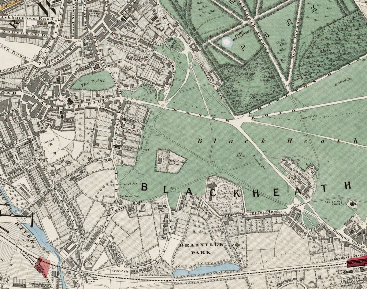 • Greenwich Park and Blackheath are shaded in green with detailed paths and landscaping.