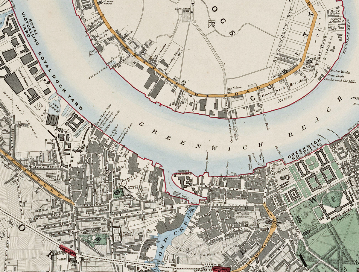 • The Thames, its wharves, and the Royal Naval Dockyard at Deptford are clearly marked.